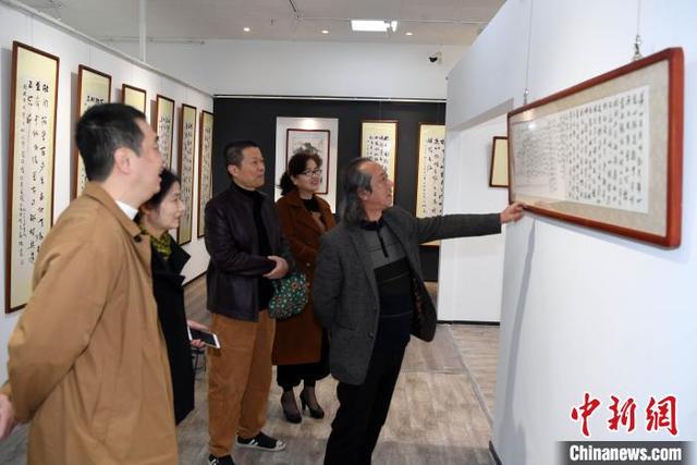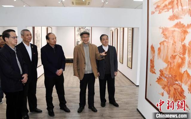 著名艺术家沈岩先生(右二)向来宾介绍在馆内展出、由他本人创作的80多幅书画作品。