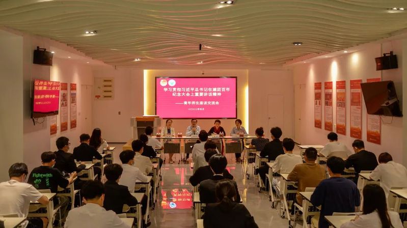 为学习贯彻习近平总书记在庆祝建团100周年大会上的重要讲话精神,2022年5月20日下午,学院团委组织召开青年师生座谈交流会,青年师生代表们在党建思政馆,再次学习习近平总书记在庆祝建团100周年大会上的重要讲话精神,畅谈感受、交流学习心得。学院党委副书记陈宜大、马克思主义学院和团委相关人员参加座谈。