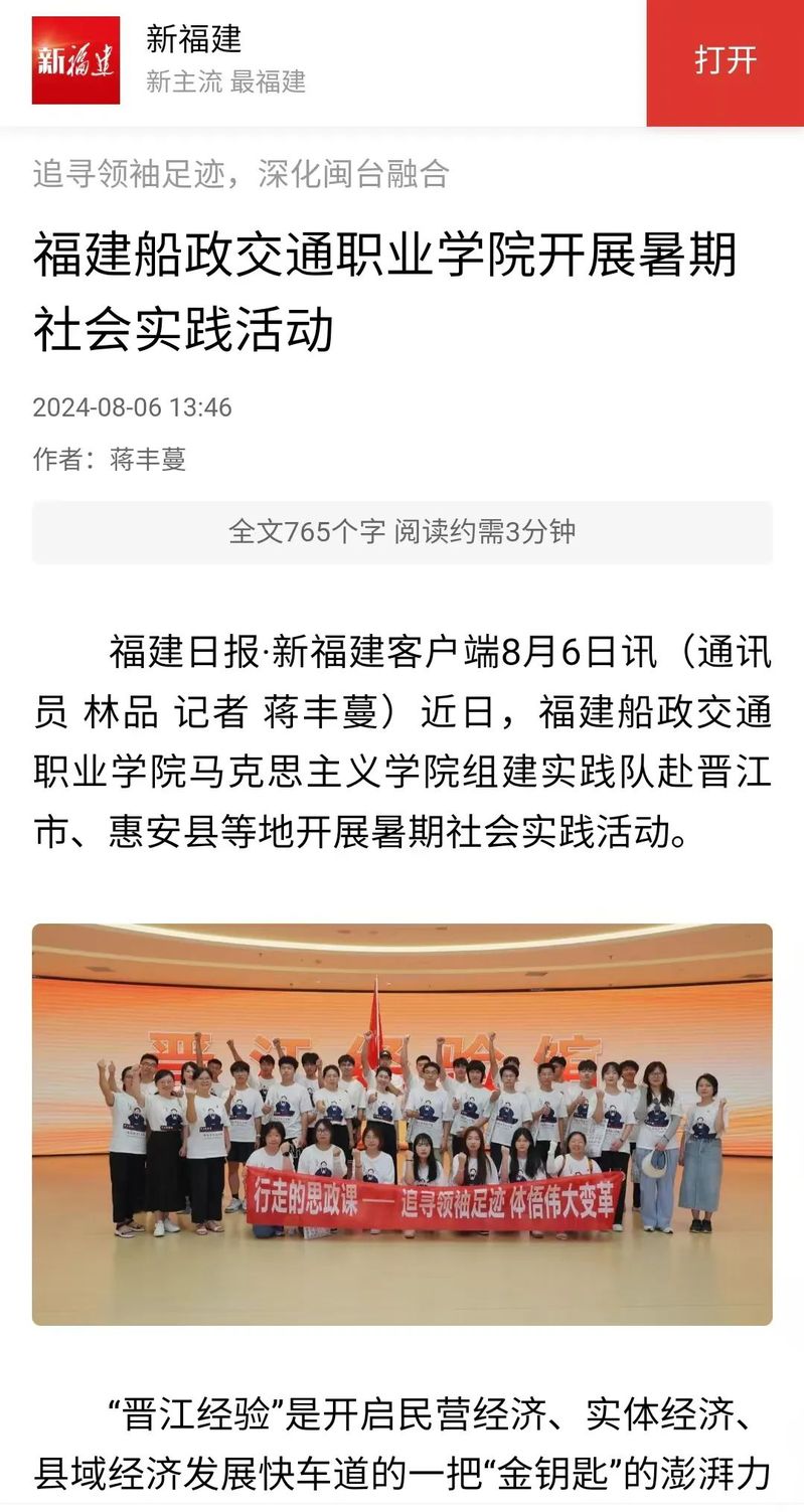“晋江经验”是开启民营经济、实体经济、县域经济发展快车道的一把“金钥匙”的澎湃力量。实践队走进晋江经验馆,重温习近平总书记对晋江发展的殷殷嘱托;走进紫帽镇紫星村,了解村民引进台湾特色农业品种、发展体验式观光农业助力乡村振兴的特色做法,切实体悟“晋江经验”所蕴含推动高质量发展的科学理念;走进福建中通快递有限公司、福建夜景辉光学科技有限公司、晋江市新顺兴装饰材料有限公司等企业,了解绿色环保下的高新技术创新之路,领会在“晋江经验”指引下,晋江市奋力书写中国式现代化县域示范的美丽图景。