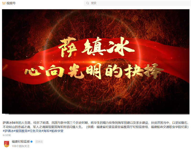 11月29日,由福建省纪委监委驻省教育厅纪检监察组和福建船政交通职业学院纪委联合制作的船政先贤家风家训宣传片《萨镇冰:心向光明的抉择》在“福建纪检监察”视频号推送。