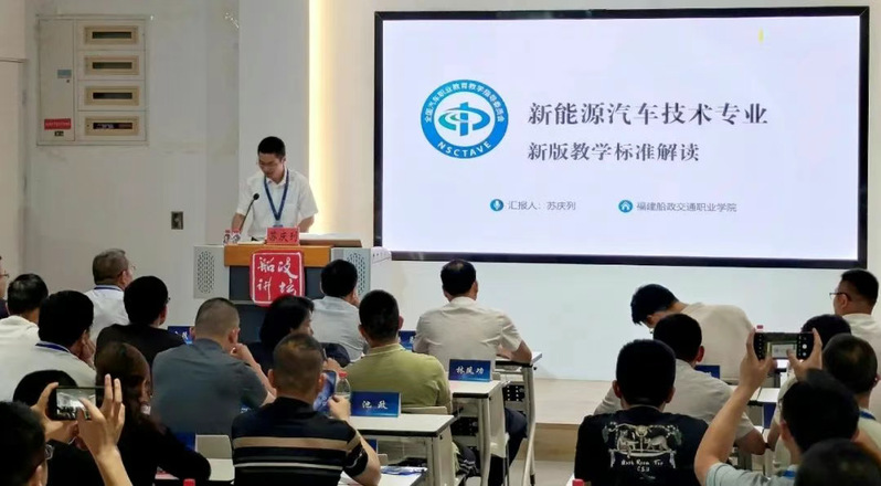在教学标准落地研讨中,汽车行指委分享《新能源汽车技术》等三门新版专业教学标准。福建船政交通职业学院汽车学院院长苏庆列进行重点解读。
