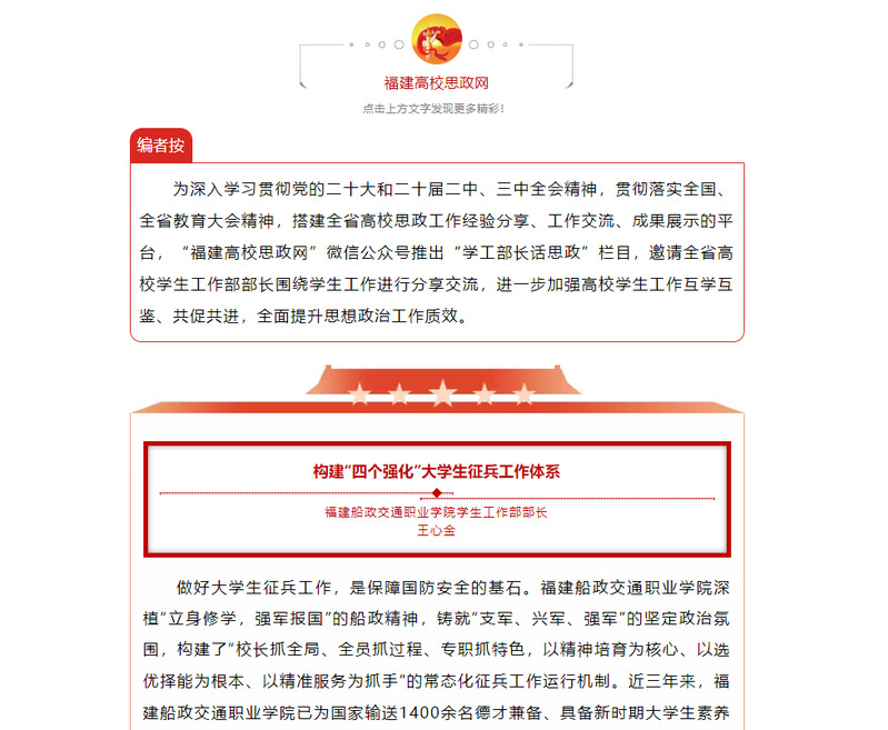 为深入学习贯彻党的二十大和二十届二中、三中全会精神,贯彻落实全国、全省教育大会精神,搭建全省高校思政工作经验分享、工作交流、成果展示的平台,“福建高校思政网”微信公众号推出“学工部长话思政”栏目,邀请全省高校学生工作部部长围绕学生工作进行分享交流,进一步加强高校学生工作互学互鉴、共促共进,全面提升思想政治工作质效。