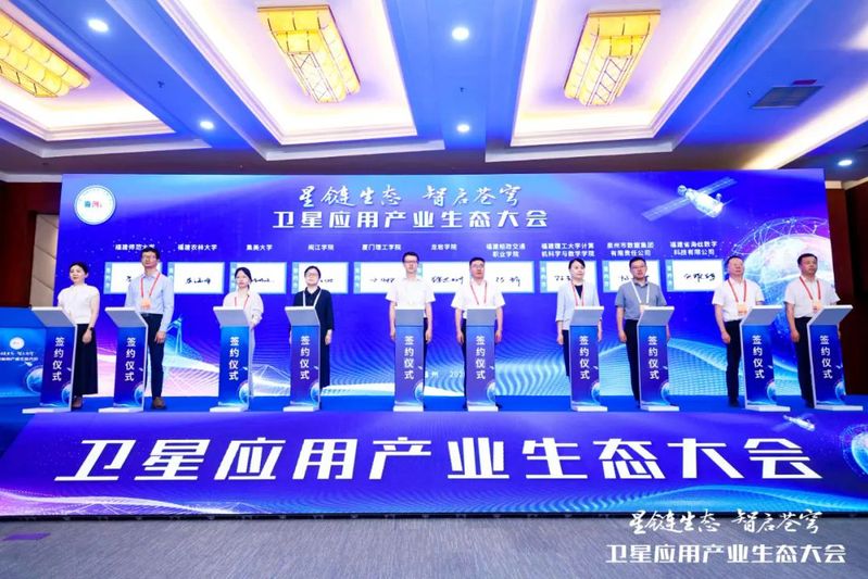 院长陈群教授作为特邀嘉宾,与福建师范大学、福建农林大学、集美大学、闽江学院等省内高校共同完成福建省卫星应用产业生态伙伴签约仪式。