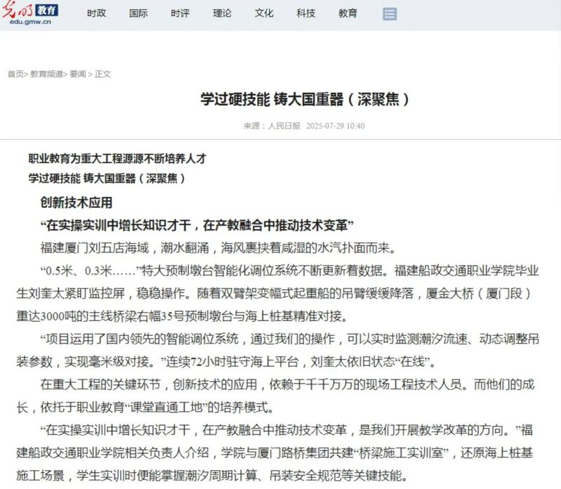 7月29日,人民网、新华网、光明网、中国网等中央主流媒体报道我院毕业生刘奎太参与厦金大桥(厦门段)建设,展现学院在产教融合育人方面所取得的显著成效。具体报道情况如下: