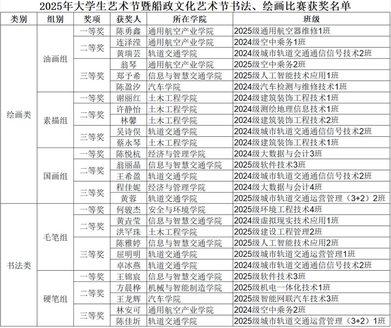 据悉,学院2025年大学生艺术节暨船政文化艺术节书法、绘画比赛由通识教育学院、宣传统战部、团委、机关党总支、图书馆、船政画院等部门共同主办,围绕国家安全、诚信立德、廉政文化、船政文化、中华优秀传统文化及铸牢中华民族共同体意识等主题,鼓励学生通过笔墨丹青展现时代风貌、传播青春正能量。自9月份启动以来,各二级学院积极组织、广泛动员,学生踊跃参与,共征集到作品153件,涵盖油画、素描、国画、毛笔书法、硬笔书法等类别。