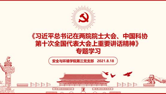 2021年8月18日,安全与环境学院第三党支部组织专题学习了习近平总书记在两院院士大会、中国科协第十次全国代表大会上重要讲话精神。与会党员教师结合自身实际工作,畅谈了学习习近平总书记重要讲话精神的体会和感受。大家一致认为习近平总书记的讲话体现了国家对科技创新工作的关心和重视,是新发展阶段全体科技工作者的根本遵循和行动指南。