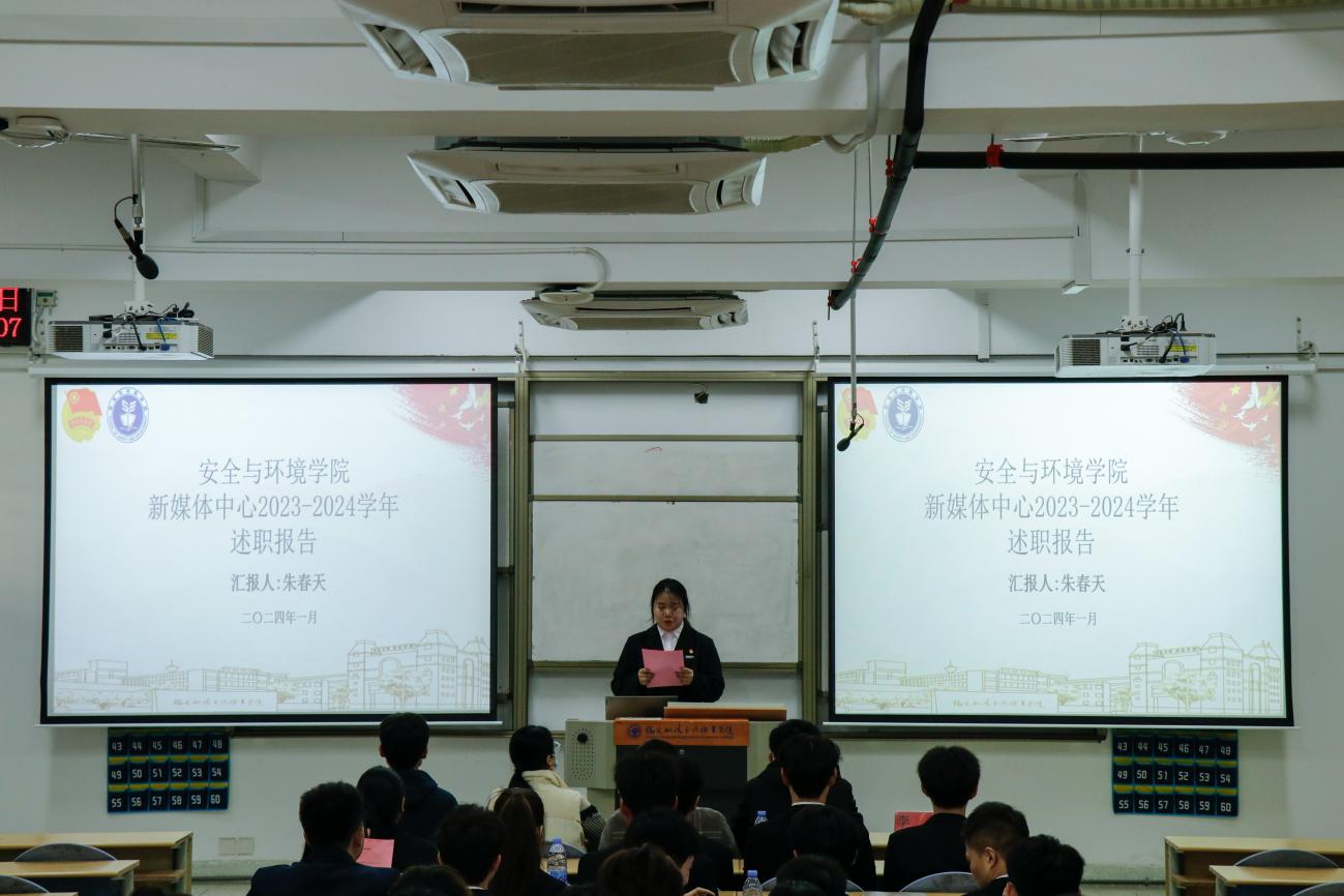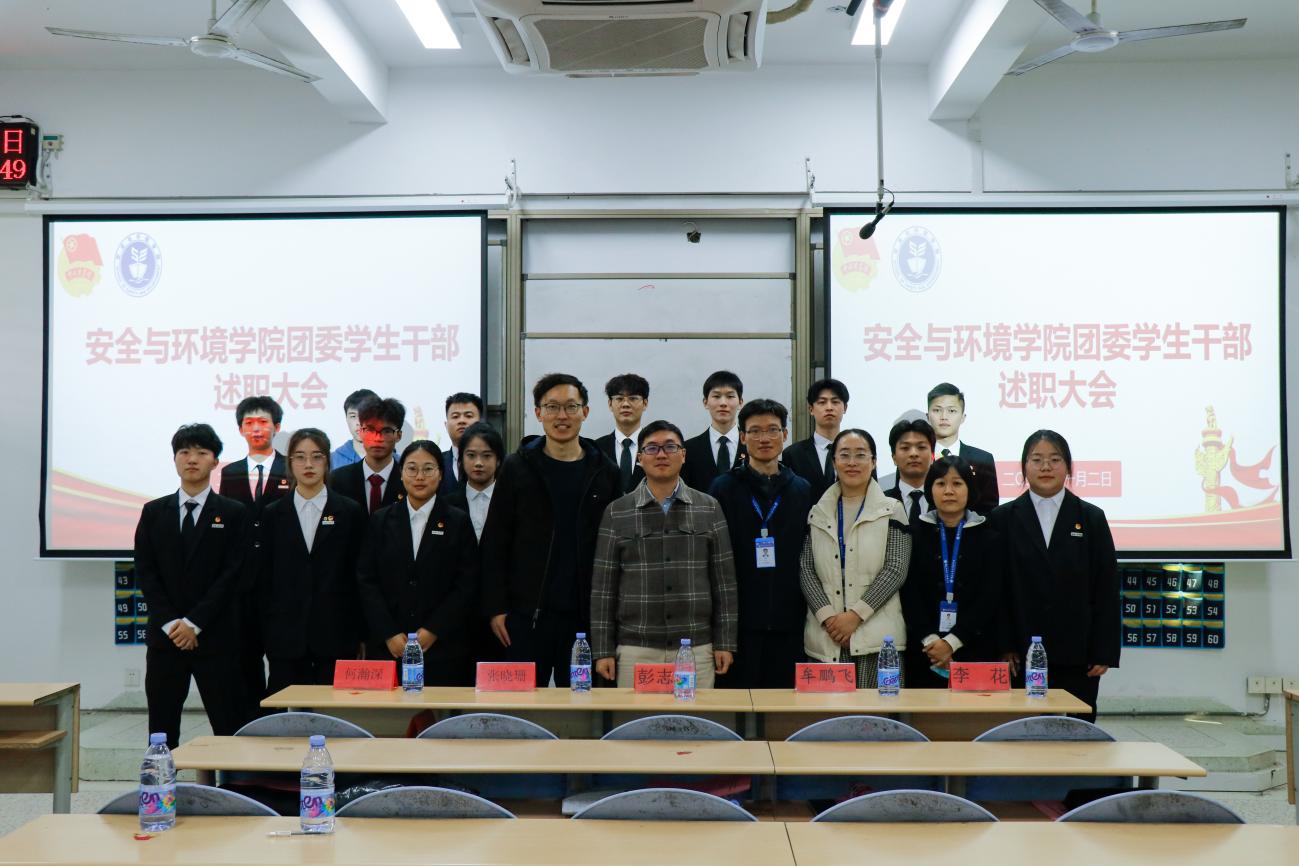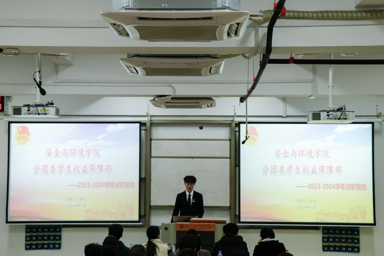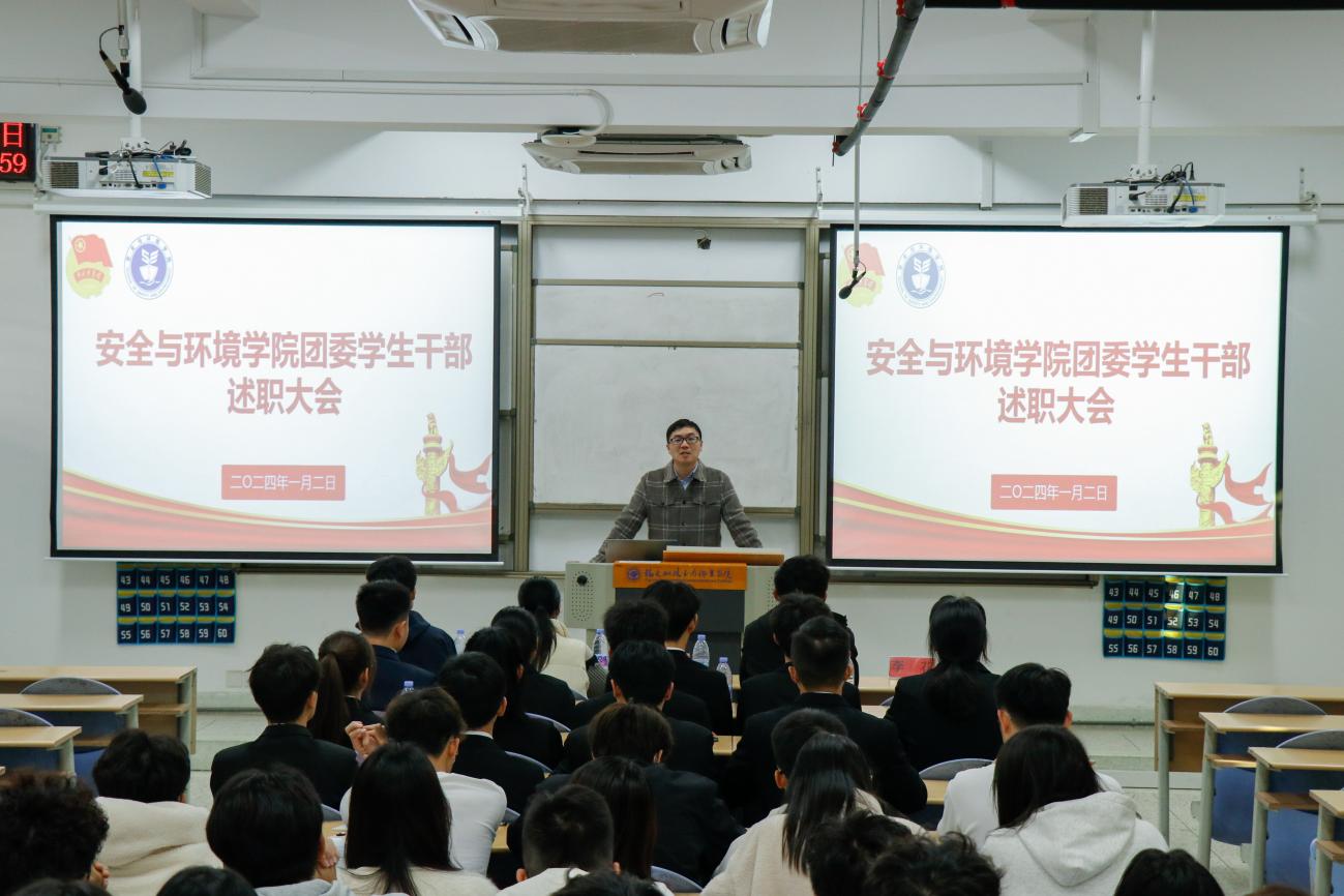 为深入学习贯彻习近平总书记关于青年工作的重要思想,进一步推动学生组织建设,提高学生干部综合素质,总结本学年工作实效,规划下一年度工作,2024年1月2日安全与环境学院在创新楼201教室组织召开团委学生干部述职大会。安全与环境学院团委书记彭志允、团委组织委员张晓珊、团委宣传委员李花、辅导员牟鹏飞、辅导员何瀚深莅临本次会议。