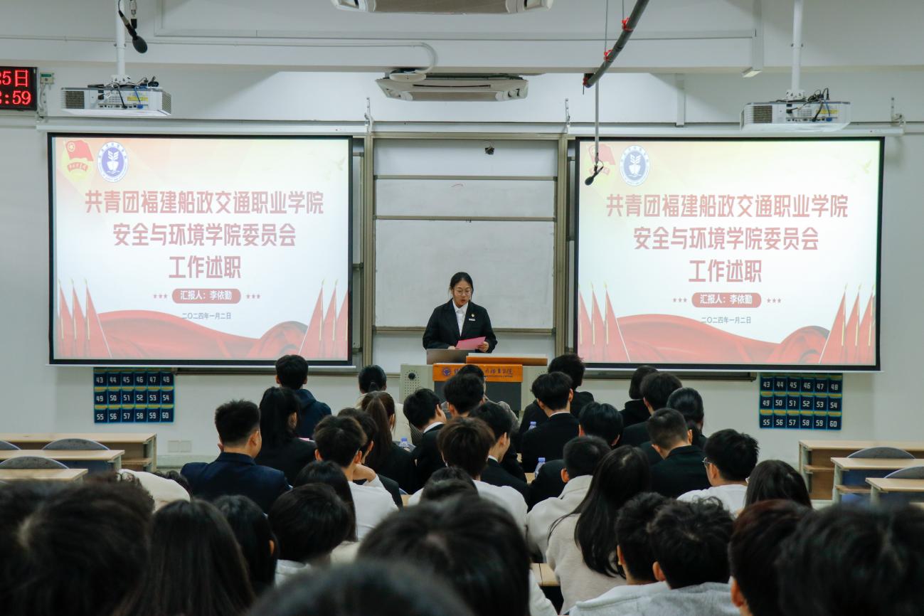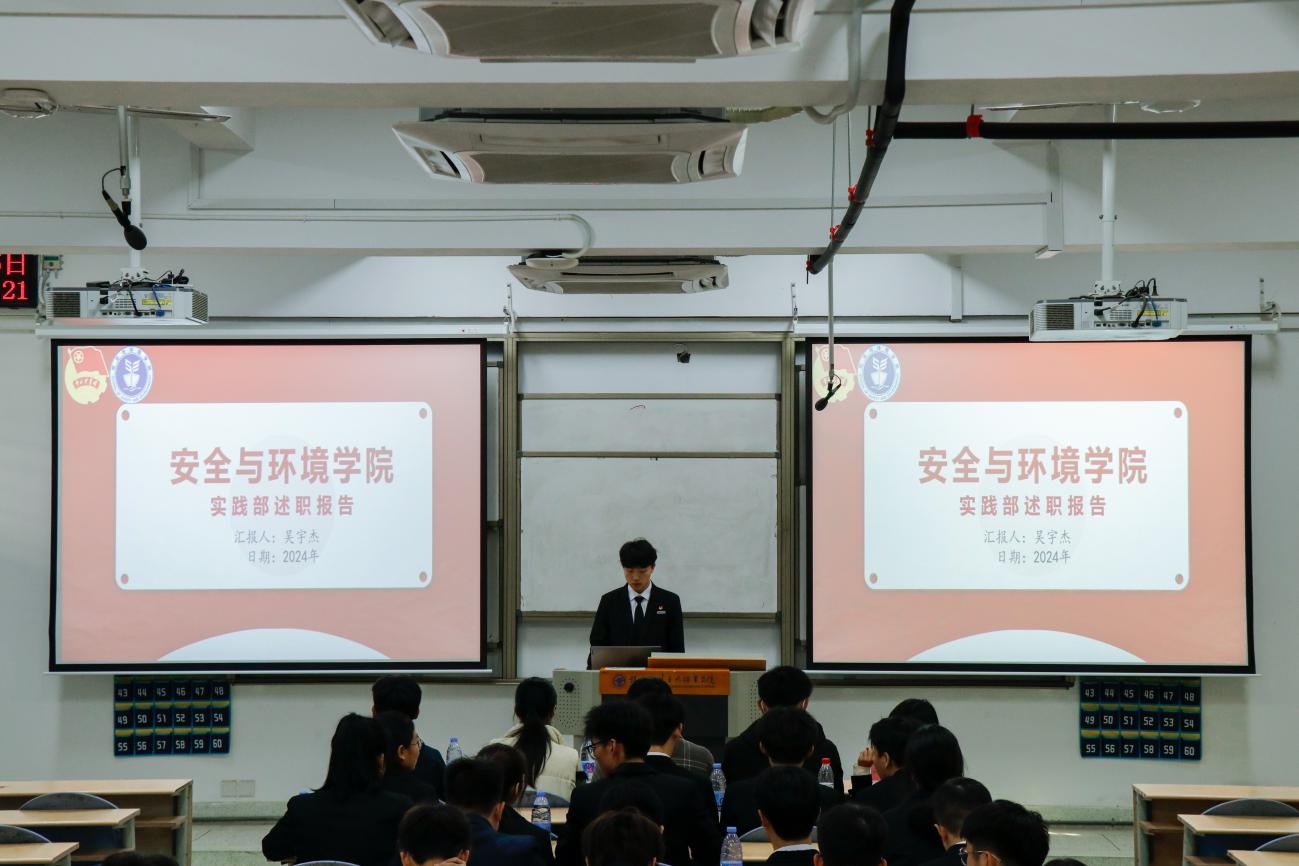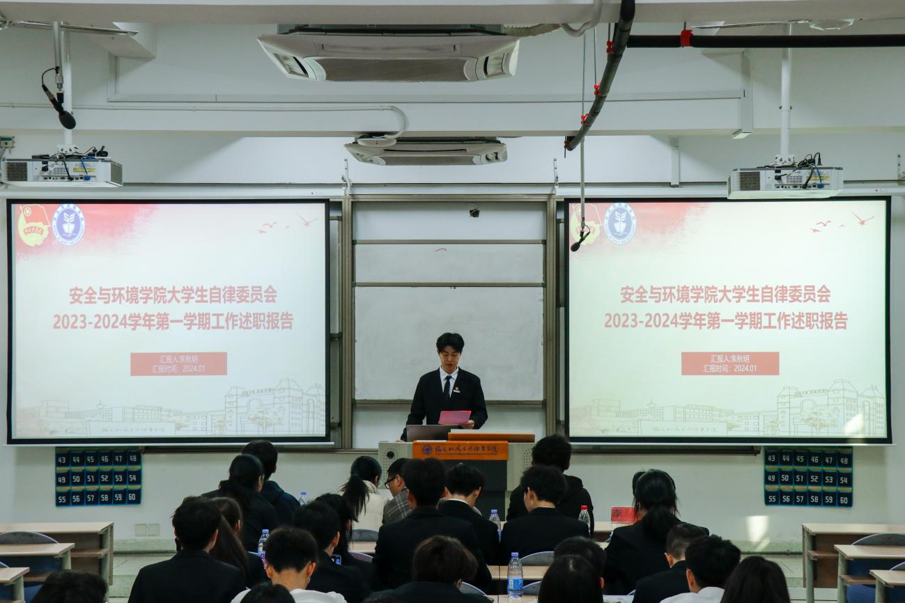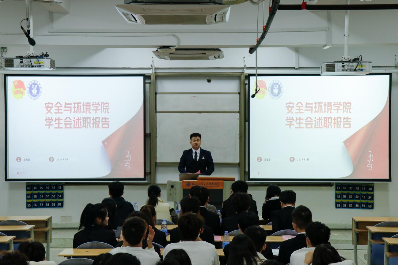 为深入学习贯彻习近平总书记关于青年工作的重要思想,进一步推动学生组织建设,提高学生干部综合素质,总结本学年工作实效,规划下一年度工作,2024年1月2日安全与环境学院在创新楼201教室组织召开团委学生干部述职大会。安全与环境学院团委书记彭志允、团委组织委员张晓珊、团委宣传委员李花、辅导员牟鹏飞、辅导员何瀚深莅临本次会议。