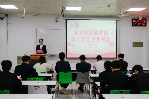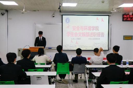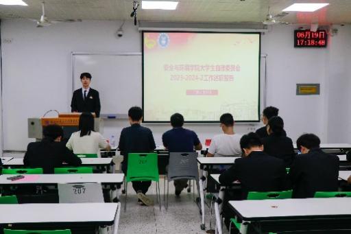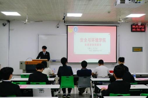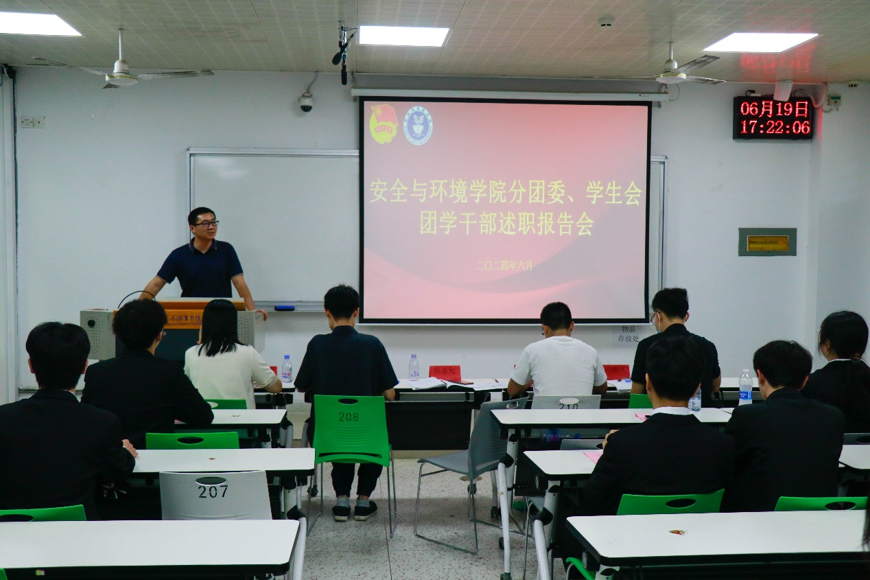为进一步落实共《关于推动高校学生会深化改革的若干意见》、《深化学校共青团改革的若干措施》等文件精神,推动学院学生干部队伍的建设,6月19日下午,2023-2024学年安全与环境学院学生部门述职大会于创新楼208教室召开。学院团委书记彭志允、团委副书记徐林悦慰、团委组织委员张晓珊、学院第一党支部书记何瀚深、辅导员牟鹏飞莅临参加本次述职大会。