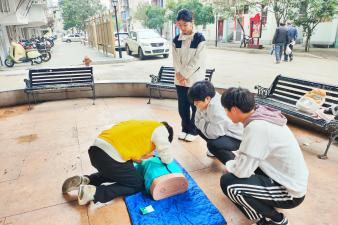 在急救救护科普活动现场,志愿者们向居民讲解心肺复苏救护和包扎的基本知识以及应用环境,随后居民们在志愿者们的协助下进行实操。通过在仿真人体模型上演示心肺复苏救护,真人练习绷带包扎,让居民们对急救知识有了更深刻的认识与了解。
