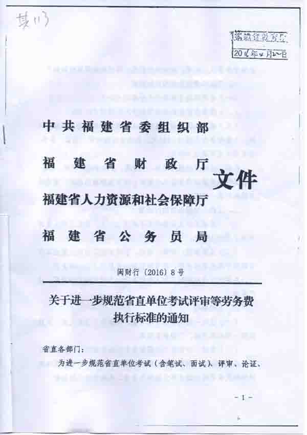 关于进一步规范省直单位考试评审等劳务费执行标准的通知(闽财行〔2016〕8号)