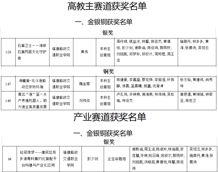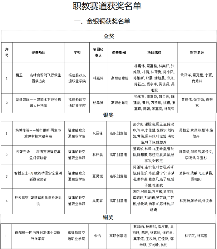 近日,根据“福建省教育厅关于公布福建省大学生创新大赛(2025)获奖名单的通知(闽教高〔2025〕20号)”文件,我院在本届大赛中荣获2金6银3铜的成绩。其中,蓝渊智眸——智能水下巡检机器人开拓者和精卫——高精度智能飞行救生圈供应商两个项目获得福建省大学生创新大赛(2025)(职教赛道)金奖;砼筑绿梦——建筑垃圾多源骨料集约化智配平台构建与产业化应用项目获得产业命题赛道银奖;石厝卫士——海岸石厝民居文化守护者项目获得高教主赛道银奖。