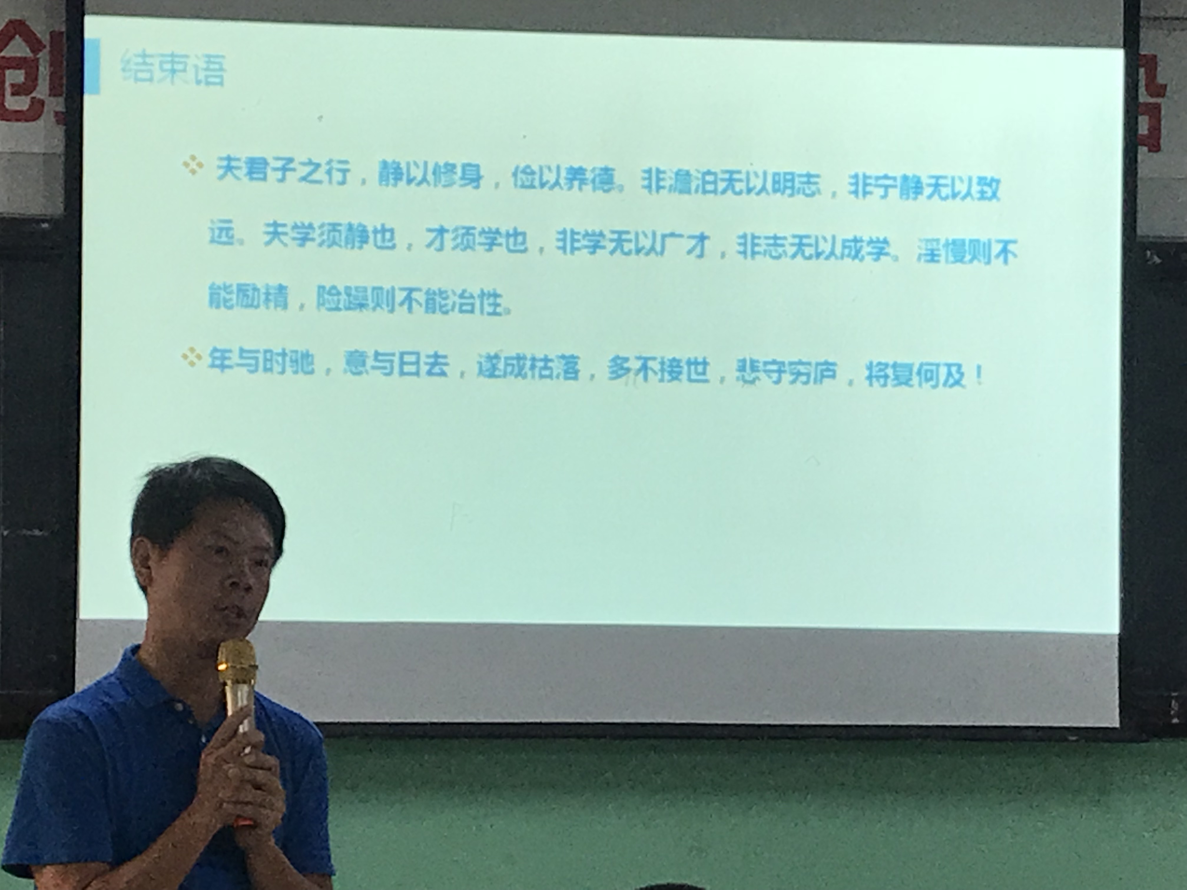 老师以“ 夫君子之行,静以修身,俭以养德。非澹泊无以明志,非宁静无以致远。夫学须静也,才须学也,非学无以广才,非志无以成学。淫慢则不能励精,险躁则不能冶性。”“年与时驰,意与日去,遂成枯落,多不接世,悲守穷庐,将复何及!”两句名言结束了本场讲座。