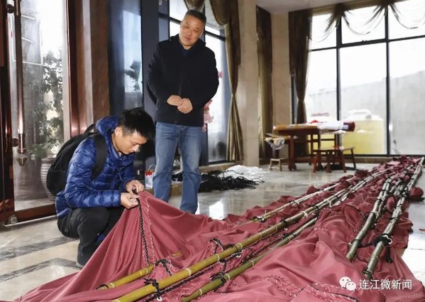 “心澜号”总设计师、福建船政交通职业学院航海学院教师江金春(左)在检查风帆