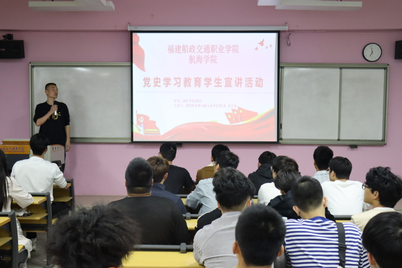 为加强党史学习,汲取精神营养,激发奋进力量,4月26日,航海学院组织开展“学党史,强信念,跟党走”党史学习教育宣讲活动。航海学院党史大学生宣讲团成员、预备党员、2019级水路运输与海事管理1班肖方洵同学担任主讲,航海学院2019级入党积极分子参加了此次活动。