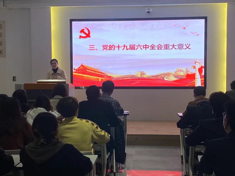 陈艳红副院长从“准确理解党的十九届六中全会历史背景”、“全面把握党的十九届六中全会核心要义”和“深刻领会党的十九届六中全会重大意义”等三个方面,对十九届六中全会进行了一个系统的回顾,并重点解读“一个报告”、“两个决议”和“一个说明”等内容。同时,结合省第十一次党代会精神与学院实际,对现阶段的我们国家职业教育存在的机遇与挑战进行了分析,提出了五个“抓住”。并指出目前正值学院“双高”建设的重要时期,如何把握其中的机遇与挑战,推动职业教育高质量发展,需要各位党员同志勇于创新,敢于担当,积极奉献。