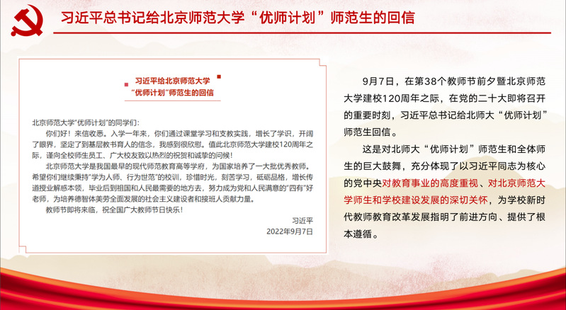 陈林泉老师:习近平总书记的回信,体现了以习近平同志为核心的党中央对教育事业发展的高度重视,对北师大师生和学校建设发展的深切关怀。作为“四有”好老师的首倡地,北师大肩负着培养追梦人和筑梦人的双重任务,教育引导党员同志广大青年学子珍惜时光,刻苦学习,砥砺品格,传承校训精神,到祖国和人民最需要的地方去建功立业。