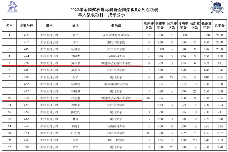 本次赛事分为精英组、公开组、大学生组、青少年组。福建船政交通职业学院航海学院组织校桨板队参加大学生组别赛事。黄炜强、林文鑫发扬船政精神,努力拼搏,分别取得大学生组总积分第5名和第10名的好成绩。