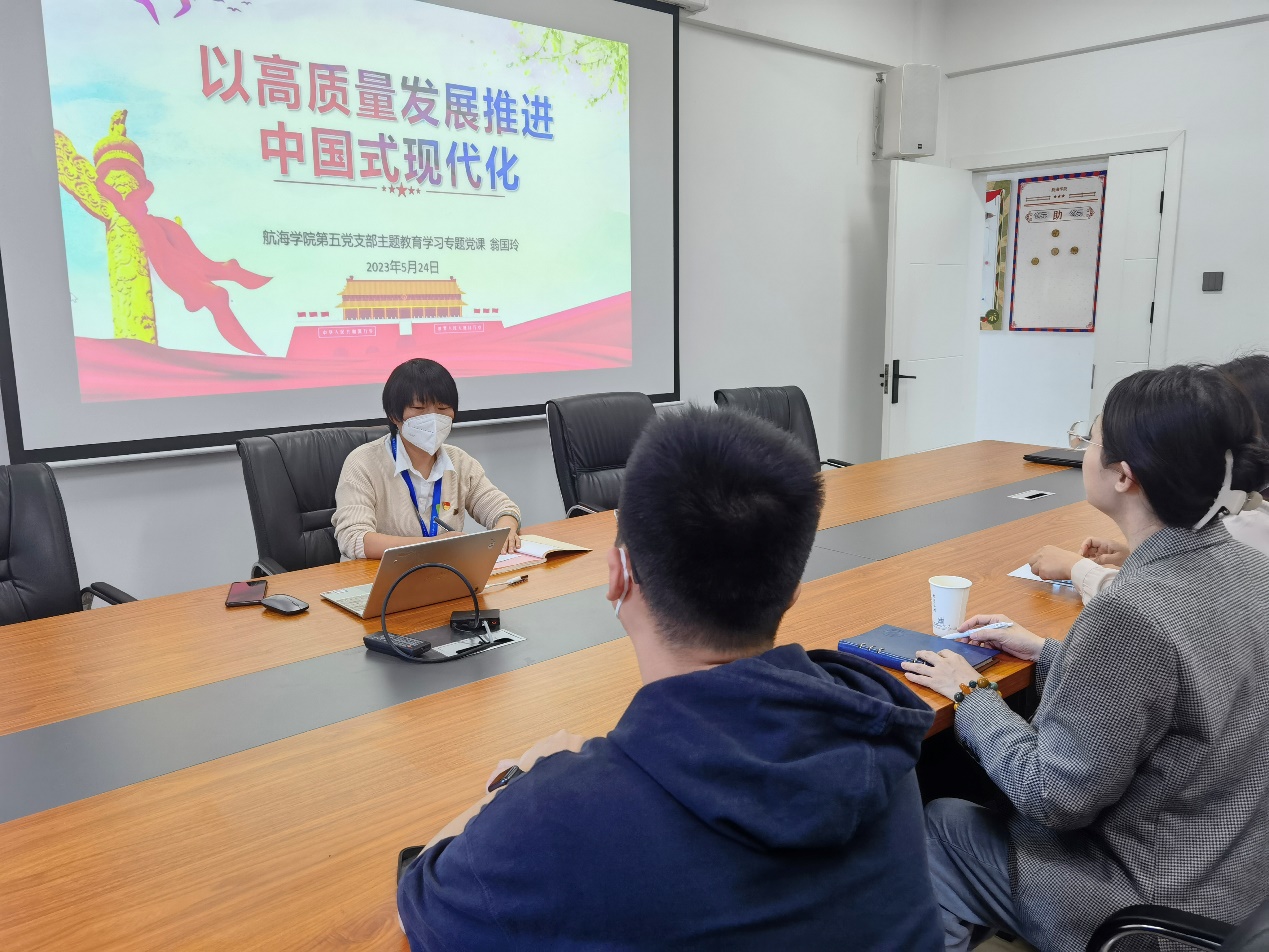 为推进党的二十大精神学习的宣传贯彻深入开展,5月24日,航海学院第五党支部书记翁国玲于29号楼307会议室开展了“以高质量发展推进中国式现代化”为题的党课,党支部全体党员参加。