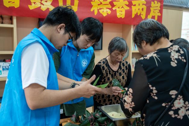 端午节前夕,鼓山镇长者食堂里,社区里的老年居民、党员志愿者和台同胞们围拢在一起,谈民俗、包粽子、做香囊,共迎传统佳节端午节,大家畅聊端午习俗,“粽”享相聚情谊。