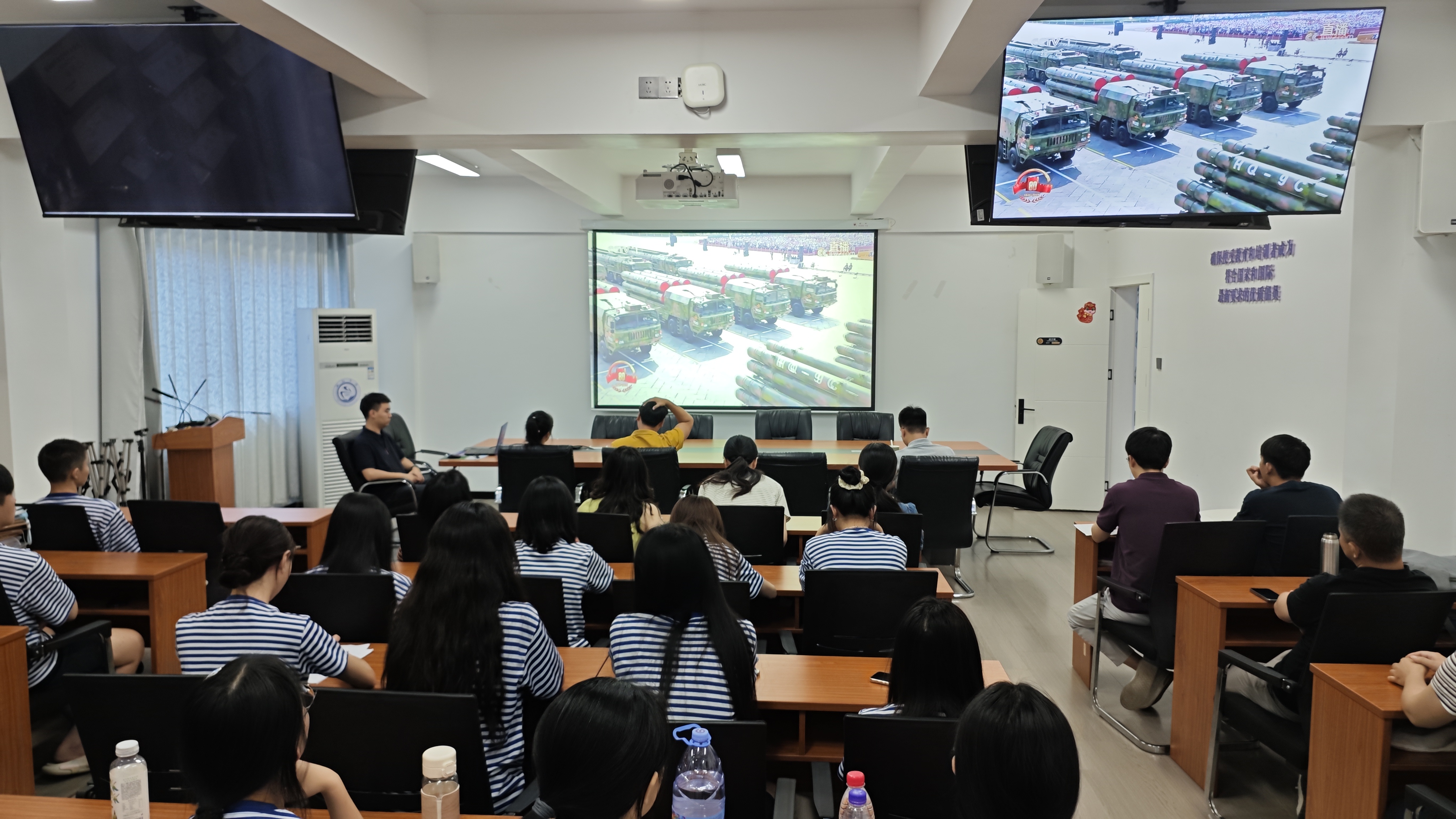上午9时,航海学院的师生们便早早地齐聚在学院会议室、教室等场所。他们的脸上洋溢着期待与兴奋,眼神中满是对祖国的热爱与敬意,静静地等待着阅兵式的开场。