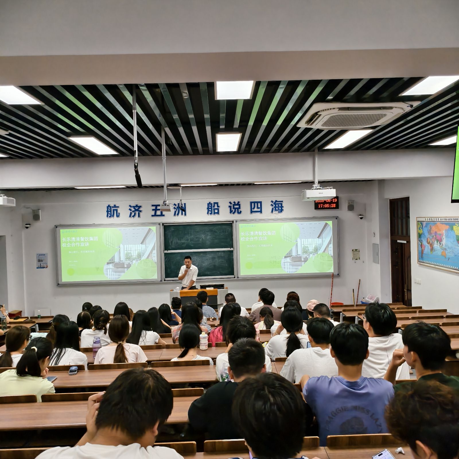 随后,长乐清清大酒店人事经理从本土酒店运营视角出发,介绍了酒店的发展规模、特色业务。长乐清清大酒店作为区域知名酒店,在餐饮、住宿等板块独具优势。人事经理针对酒店各岗位需求,如前厅接待、餐饮服务等,详细解读了岗位要求与职业发展方向,并分享了酒店的人才培养体系与员工福利,让同学们对本地酒店行业有了更直观、深入的认识。