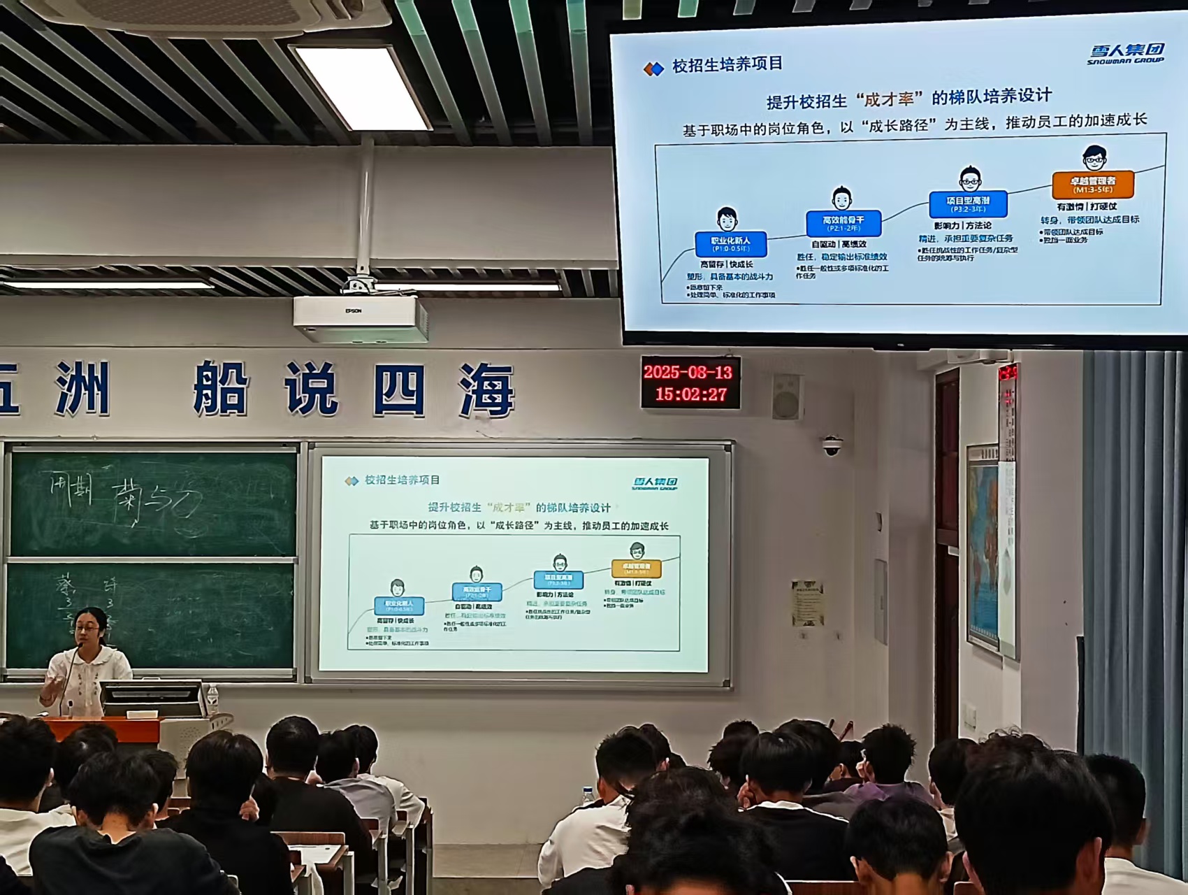 福建雪人集团股份有限公司创建于2000年3月,于2011年12月在中国深圳证券交易所上市,是一家以热能动力技术为核心,精密制造工艺为基础的冷热与新能源装备制造高新技术企业。公司致力于在冷链物流、工业制冷、清洁能源以及氢能动力四大领域为全球提供产品、技术以及服务,并致力于成为全球冷热与新能源装备制造行业引领者。福建雪人集团股份有限公司的人力资源专员和生产一线师傅进行了精彩宣讲,给学生示范走进职场的第一步。