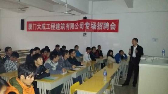 为进一步做好我系2014届毕业生就业工作,为毕业生求职和用人单位招聘人才搭建平台、提供更好的服务,我系于2013年12月10日下午2:30到5:30在信息系2-1教室召开了厦门大成工程建设有限公司专场招聘会。