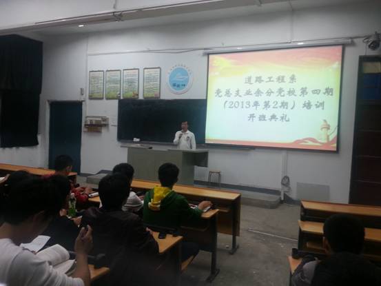 2013年10月28日晚上7:00,道路工程系党总支业余分党校第四期在土建楼二楼举行入党积极分子培训班开班典礼。道路工程系王心金书记,曾新平辅导员, 11级第一批、第二批、第三批入党积极分子共计16名学生参加了本次开班典礼。