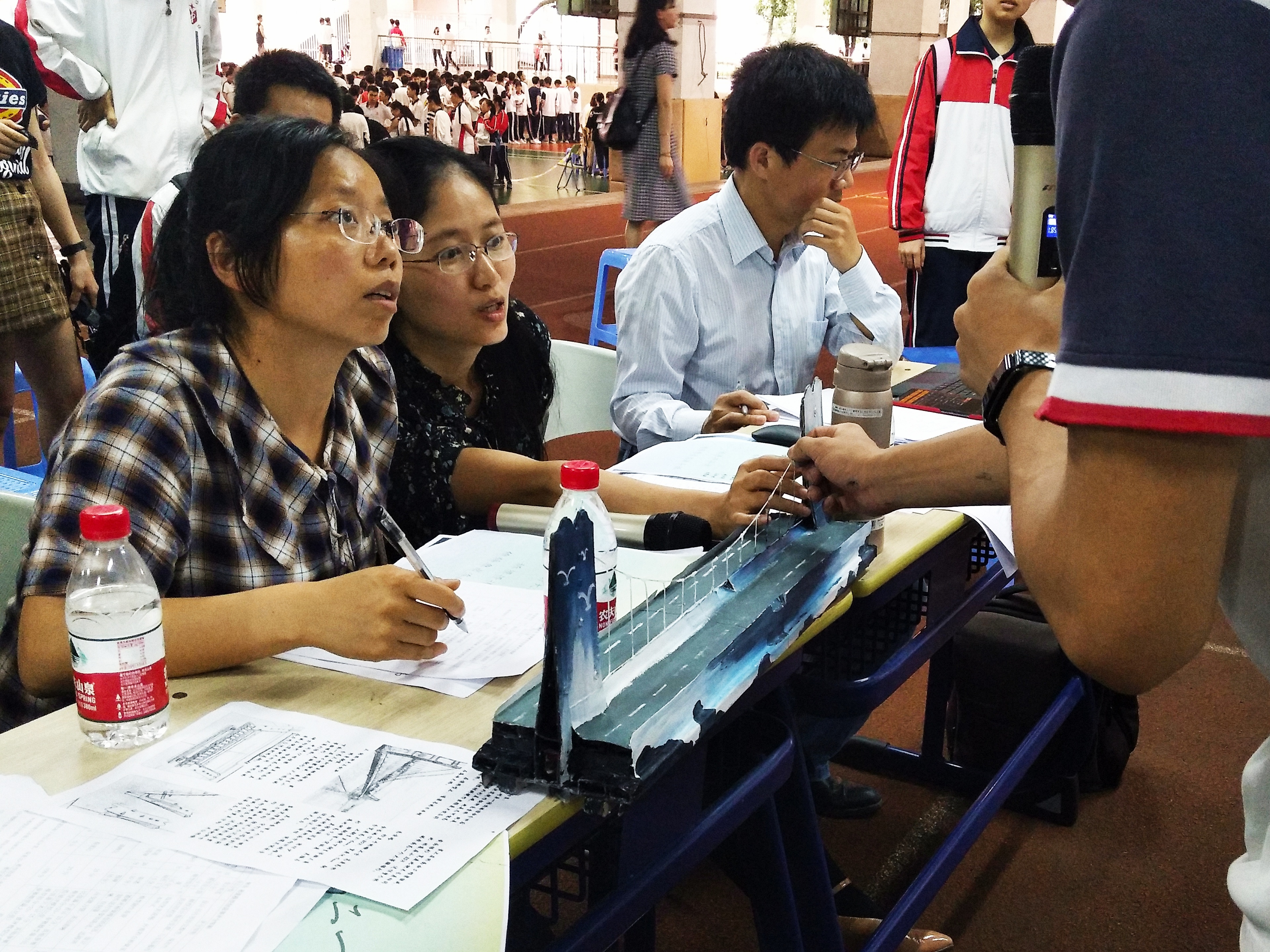 5月17日下午,比赛在师大附中室内体育馆内进行,我系高璋生、陈世九、曾惠珍、王桂茵等四位教师受邀担任比赛评委。共有11组同学相继上台,向评委老师和观众们展示自己的参赛作品,介绍模型与的设计思路和制作过程,并进行了模型加载测试。随后评委老师对参赛作品进行提问点评、打分并提出可行性建议。比赛现场气氛活跃,尤其是模型加载环节更是将比赛气氛推向高潮,赢得了同学们的阵阵掌声。