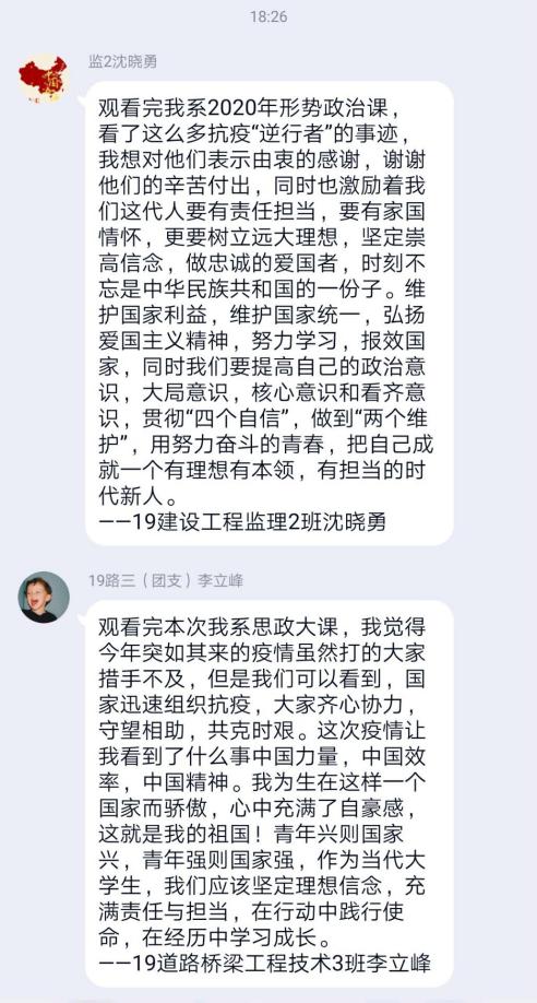 在本次的课程中看了这么多抗“疫”“逆行者”的事迹,我想对他们表示由衷的感谢,谢谢他们的辛苦付出,同时这次的事迹也激励着我们这代人要有责任担当,要有家国情怀,更要树立远大理想,坚定崇高信念,做忠诚的爱国者,时刻不忘自己是中华民族共和国的一份子。我们不仅要维护国家利益,维护国家统一,弘扬爱国主义精神,努力学习,报效国家,同时,我们还要用努力奋斗的青春,把自己成就一个有理想、有本领、有担当的时代新人。——19建设工程监理2班沈晓勇