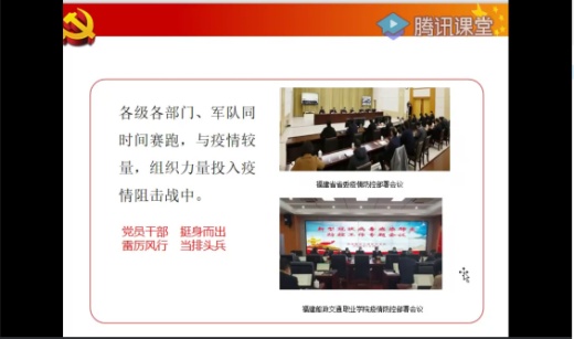 本次课程共分为三个部分,第一部分为这段时间我们经历了什么?通过翻开日历与学生一起回放疫情发生后党中央高度重视,习近平总书记亲自指挥,全国一盘棋,联防联控集中力量办大事,全国人民守望相助,共克时艰历程,中国能在较短时间内有效遏制住疫情的蔓延,体现出中国力量、中国精神、中国效率,充分彰显了中国共产党有力的领导和中国制度、依靠人民群众抗击疫情等显著的优势,激发同学们的爱国情怀、坚定战“疫”必胜信心、树立人类命运共同体理念。在第二部分我们看到什么?透过全球战“疫”烽烟使我们真切地感受到:正是有了中国共产党这个总揽全局、协调各方的领导核心,中国社会集中力量办大事就有了“主心骨”、有了方向感、有了向心力。课程中还结合抗“疫”过程习总书记和党中央始终把人民生命安全放在首位,中共产党员挺身而出,基层党组织发挥了堡垒作用,全民动员,齐心协力,驰援“逆行者”无畏担当的鲜活的例子,让同学们感受到中国人民的不屈不挠的精神和仁心大爱与责任担当。第三部分我们应该做什么?中林霞书记要求同学们要懂得在经历中学习和成长,要有坚定理想信念,责任担当,并从行动中践行,增强“四个意识”,坚定“四个自信”,做到“两个维护”,要有家国情怀、远大理想、责任和担当、勇于拼搏精神,要用奋斗的青春,把自己成就为一个有理想、有本领、有担当的时代新人。