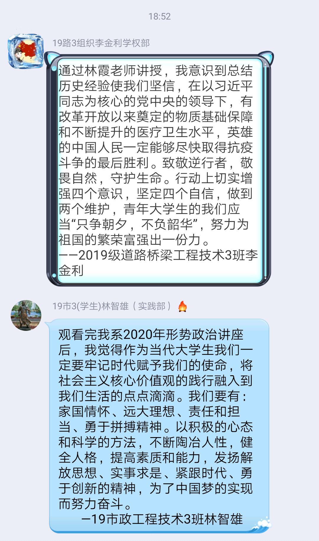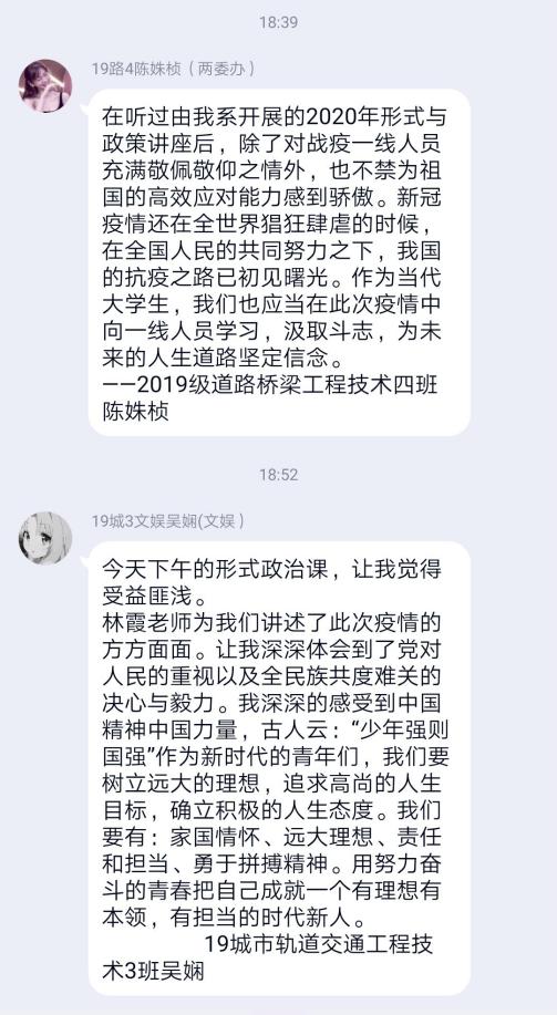 林霞书记为我们讲述了此次疫情的方方面面。让我深深体会到了党对人民的重视以及全民族共度难关的决心与毅力。我深深的感受到中国精神中国力量,古人云:“少年强则国强”作为新时代的青年们,我们要树立远大的理想,追求高尚的人生目标,确立积极的人生态度。我们要有:家国情怀、远大理想、责任和担当、勇于拼搏精神。用努力奋斗的青春把自己成就一个有理想有本领,有担当的时代新人。 —— 2019级城市轨道交通工程技术3班吴娴