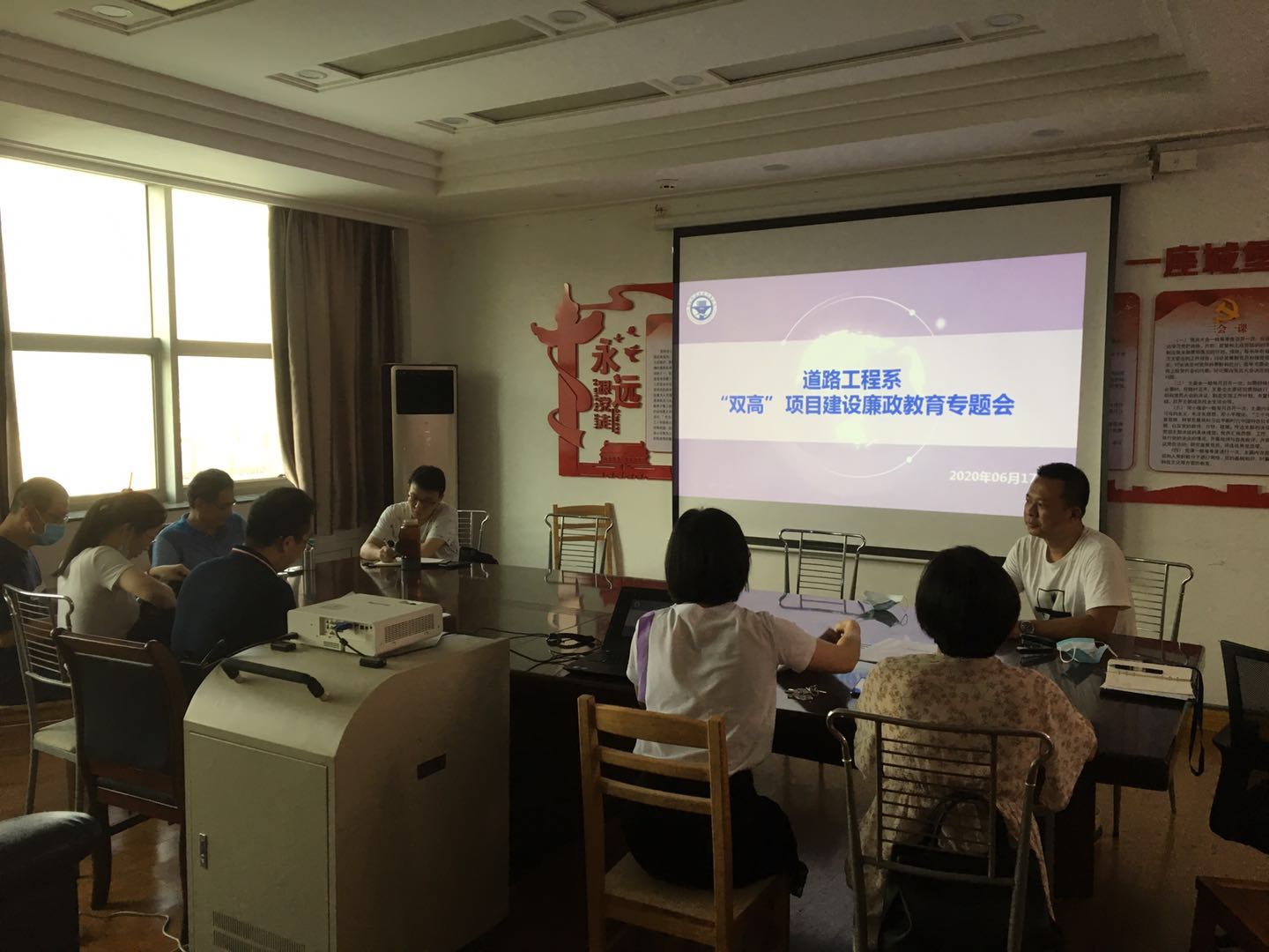 2020年6月17日,道路工程系系主任高教授组织部分有“双高”实验实训室建设任务的教师在高区科技楼1009办公室召开“双高”项目建设廉政教育专题会。会议由黄颖副主任主持。
