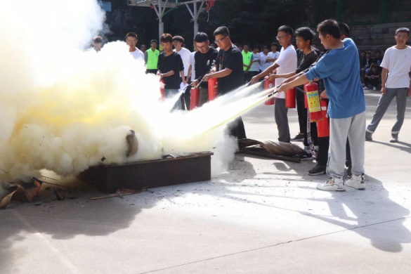 在高盖山篮球场,首先由学院自律会负责人向同学讲解宿舍消防安全的重要性及用电相关注意事项;接着由校园110联动队队员为同学们讲解并展示消防水带和灭火器的正确使用方法;随后各班代表出场进行灭火练习;最后师生代表共同在横幅上签字,郑重承诺严格遵守校园消防安全规则。