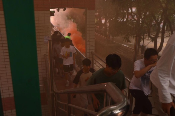 中午12:00,随着悠长的警铃声响起,各班学生在负责人的指挥下弯着腰,猫着步,捂住口鼻,沿着指定楼梯口快速前进,有序撤离到安全地带。