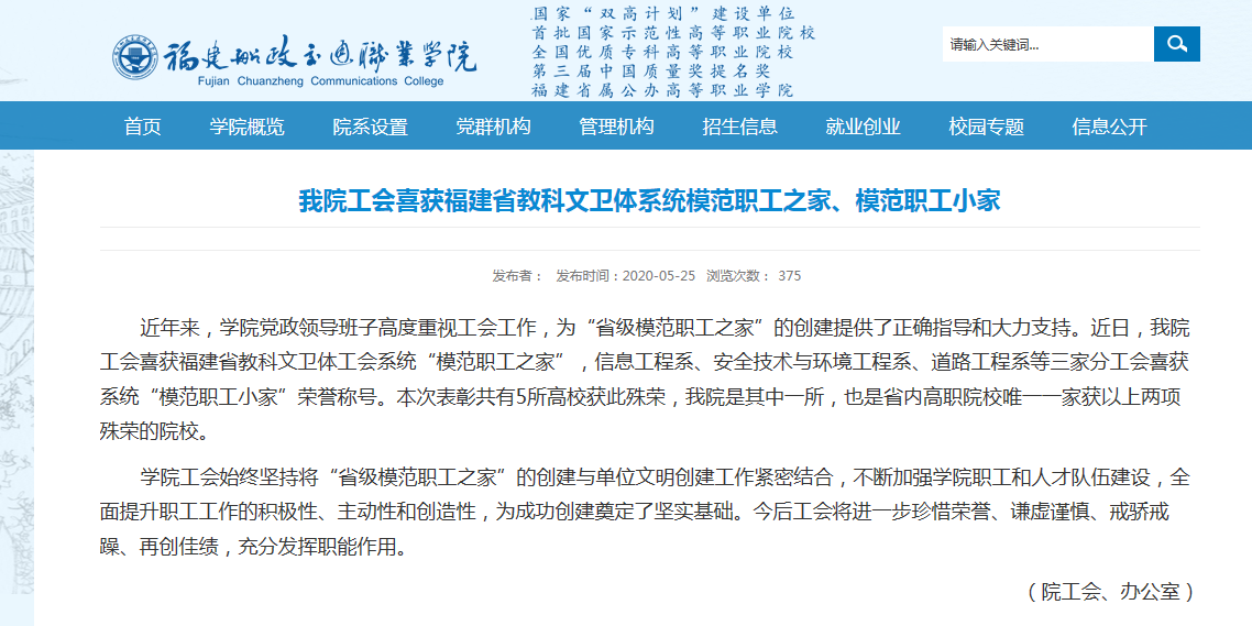近年来,学院党政领导班子高度重视工会工作,为“省级模范职工之家”的创建提供了正确指导和大力支持。近日,我院工会喜获福建省教科文卫体工会系统“模范职工之家”,信息工程系、安全技术与环境工程系、道路工程系等三家分工会喜获系统“模范职工小家”荣誉称号。本次表彰共有5所高校获此殊荣,我院是其中一所,也是省内高职院校唯一一家获以上两项殊荣的院校。