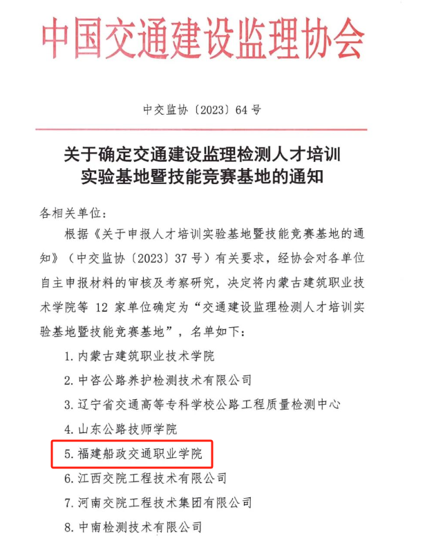 此次评审是中国交通建设监理协会为全面推动交通建设监理检测行业高质量发展,丰富交通建设监理检测行业高素质技能人才培育形式的重要举措。通过对全国各单位申报资料的审核及考察研究,共确定了12家单位为交通建设监理检测人才培训实验基地暨技能竞赛基地。