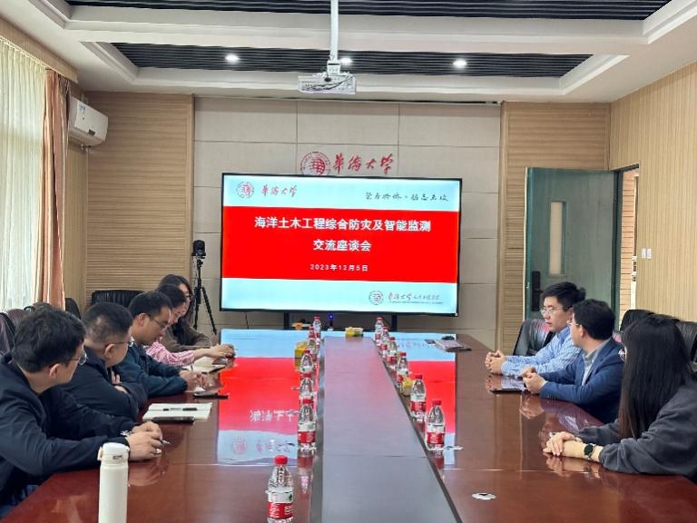 华侨大学侯炜教授和福建船政交通职业学院土木工程学院朱明栓副院长分别介绍了代表团的成员,并分享了各自学校的专业和科研背景。华侨大学代表团针对海洋土木工程、智慧工地等研究方向的最新进展进行了分享与介绍。双方就海洋土木工程新材料的应用、技术趋势以及海洋工程领域的挑战进行了深入交流,并探讨了未来合作的潜力与可能性。