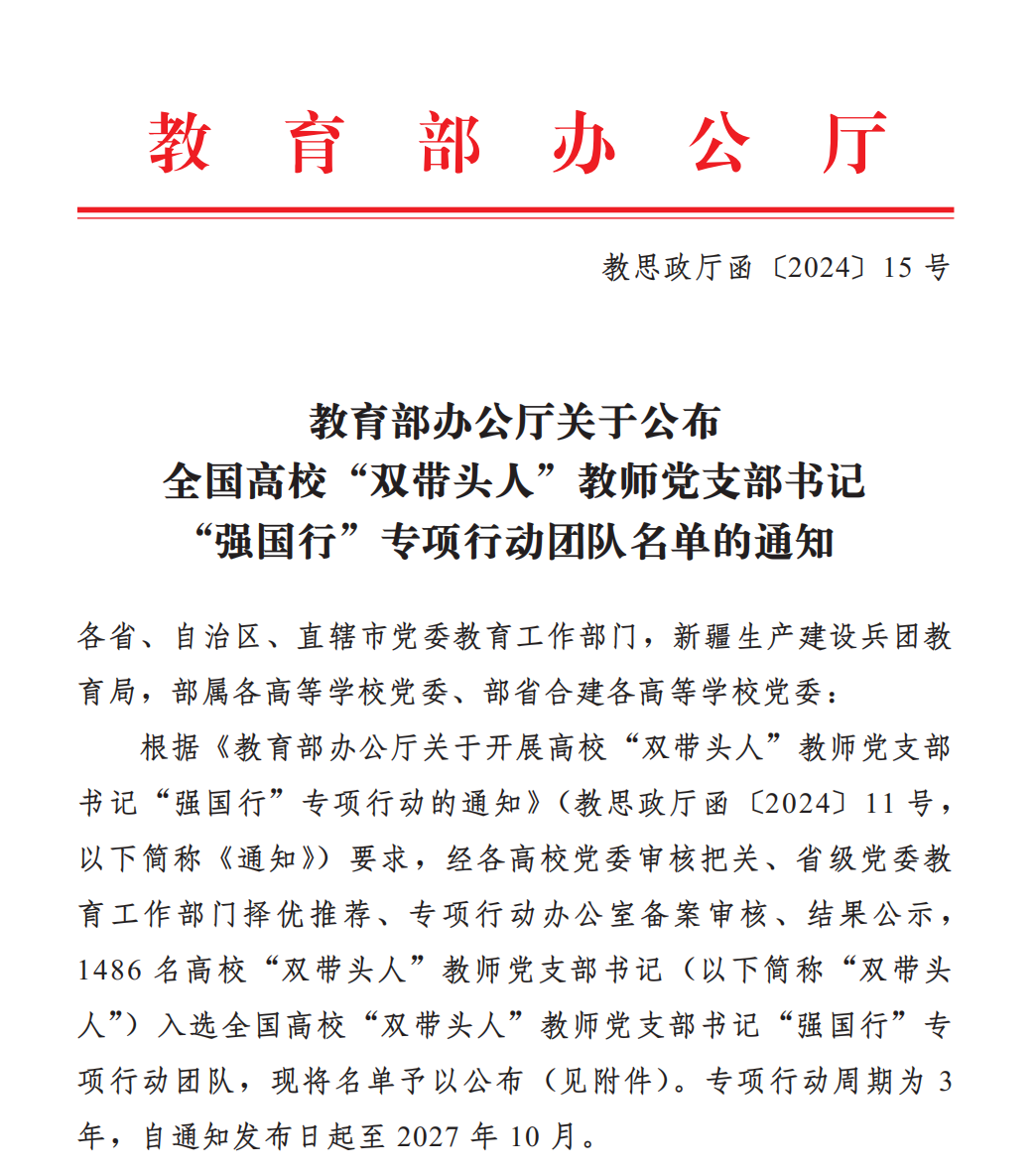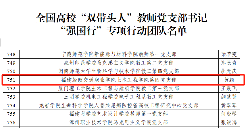 近日,教育部办公厅公布了全国高校“双带头人”教师党支部书记“强国行”专项行动团队名单,土木工程学院第四党支部(负责人:黄颖)入选全国高校“双带头人”教师党支部书记“强国行”专项行动团队。