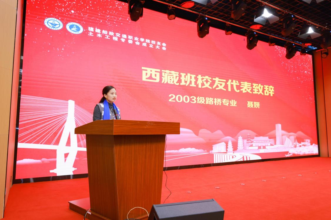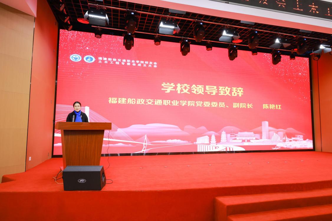 福建船政交通职业学院党委委员,副院长,校友会会长陈艳红致辞,回顾学院的发展历程,强调了校友在学院建设中的重要作用,并对专委会的未来工作提出了殷切的期望和具体的要求,希望专委会能够成为推动学院乃至行业进步的重要力量。