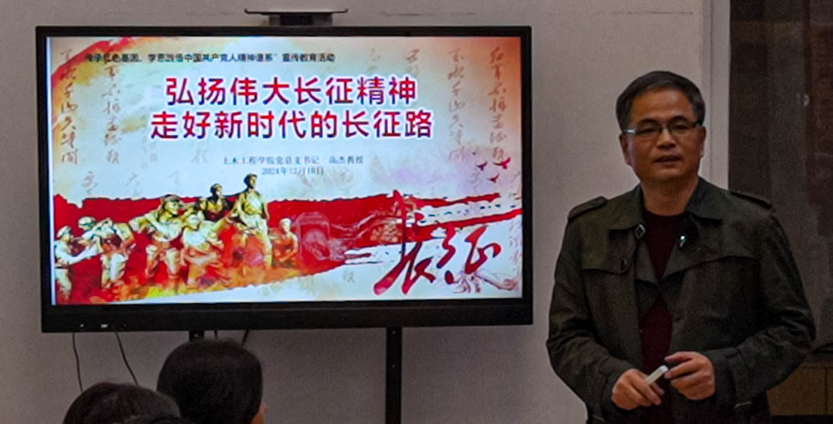 为深入学习宣传贯彻习近平新时代中国特色社会主义思想和党的二十届三中全会精神,引导青年学生坚定马克思主义信仰、中国特色社会主义信念、中华民族伟大复兴信心,深刻领悟中国共产党人精神谱系的丰富内涵和时代意义,传承红色基因,赓续红色血脉,2024年12月10日下午,土木工程学院党总支书记高杰教授在福航园“一站式”学生社区思政引领室以“弘扬伟大长征精神,走好新时代的长征路”为题给青年学生上形势与政策课暨专题思政课。