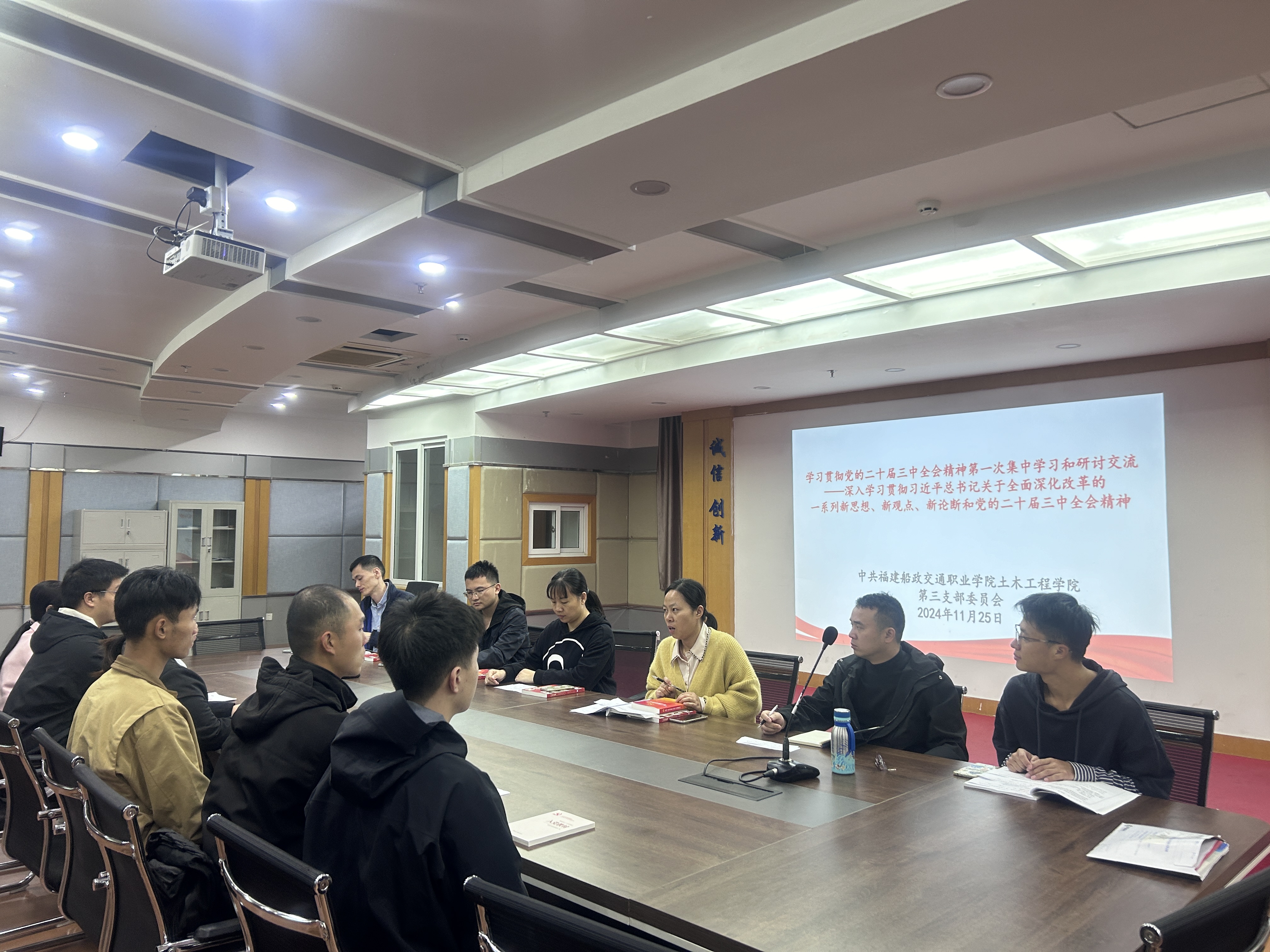 党的二十届三中全会强调教育、科技、人才为中国式现代化的基础性、战略性支撑,并作出深化教育综合改革的重要部署。这些措施旨在实现从教育大国向教育强国的跨越,为推进中国式现代化提供全方位的人才支撑和智力支持。下一步,土木工程学院党总支将认真落实新一轮全国党员教育培训工作规划,持续把学习贯彻党的二十届三中全会精神与各项工作实际结合起来,以学促干、学用结合,坚持从政治上着眼,自觉对标对表,持续加强党建引领,落细落实立德树人根本任务。扎实推进国家教师党支部书记双带头人“强国行”专项行动方案落实;用好红色文化资源,促进学生全面发展和成长成才。有效服务国家、省发展大局,全面深化改革。锚定国家、福建省重点产业布局,推进新一轮国家“双高”建设,以系统思维、创新举措谋划、推进师德师风、专业升级改造、科研创新、社会服务、国际交流与合作,闽台深度融合,全面提升高素质技能人才培养水平,以务实行动办好让党放心、让人民满意的高等职业教育,为教育强国、教育强省建设贡献更多智慧和力量。