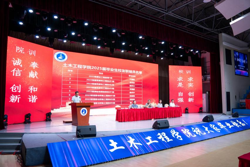2025年6月10日,土木工程学院在福道园文体中心隆重举行2025届毕业生毕业典礼。作为典礼重要环节,土木工程专业委员会正式聘任22名2025届毕业生担任校友联络员,建立校友与母校的常态化联络机制。学院党总支书记高杰、院长黄颖等领导班子成员、部分教师代表及2025届全体毕业生共同见证这一重要时刻。