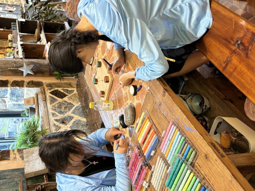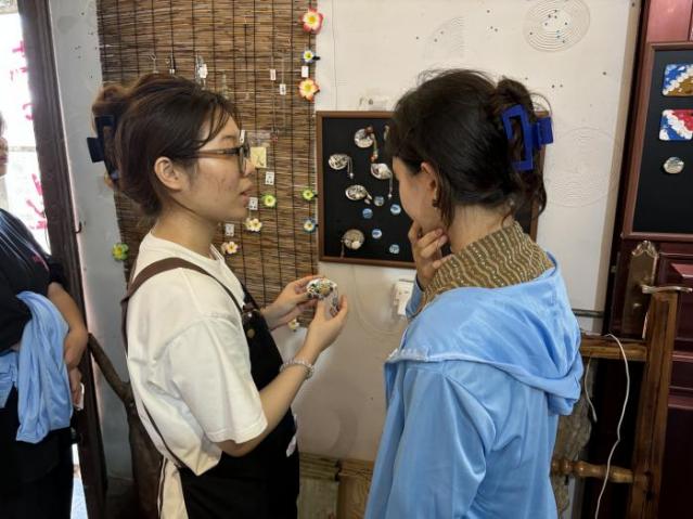 文创工坊内,贝壳拼贴的平潭海景图与台湾阿里山风光图并列陈列,别具一格的创意设计吸引不少游客驻足观赏。店员介绍:“通过融合台湾玻璃工艺与平潭贝壳资源开发的石厝主题摆件较受欢迎。”在店员的讲解演示后,队员们动手参与文创设计,亲手制作“两岸同心”主题挂件。