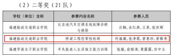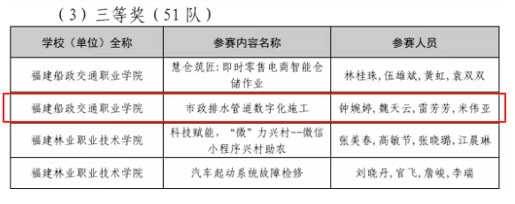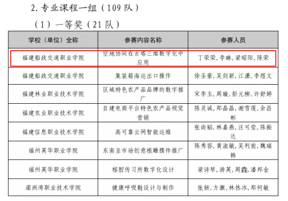 近日,2025年福建省职业院校技能大赛教学能力比赛(含中职思政)现场决赛在漳州卫生职业学院落下帷幕。本次比赛充分体现了教师是落实立德树人根本任务的主要角色,充分展现了教师专业技能、教学本领、数字素养、综合育人和自主发展的五大能力。本次比赛全省406队教师团队参赛,其中中职组170队,高职组236队。经过网络初评和现场决赛的激烈角逐,我院三支教师团队脱颖而出:丁荣荣、李琳、梁昭阳、陈荣四位教师完成的《空地协同在古塔三维数字化中应用》项目获得高职专业课程一组一等奖1项;钟婉婷、魏天云、雷芳芳、米伟亚四位教师完成的《市政排水管道数字化施工》项目,荣获该组别三等奖1项;何璐薇、张净霞、曾惠珍、曾锦秀四位教师完成的《桥梁工程经常性检测》项目获得高职专业课程二组二等奖1项;
