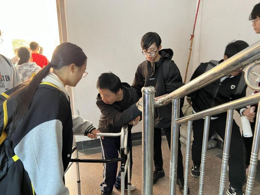 图11:党支部学生党员帮助残疾同学上下楼梯