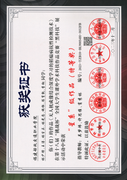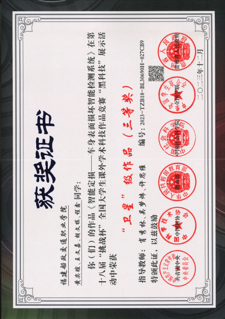 党员教师率先垂范,带领学生奋勇争先,扎根农田,把科研成果写在祖国的大地上,发挥科创育人作用,激励广大青年勤奋学习,大胆实践,勇于创新,以赛促学,以赛促教,以赛促创,由肖秀林,许思维,吴梦炜老师所带领“无人机成像结合深度学习的稻瘟病抗性检测技术”团队荣获第十八届挑战杯全国大学生课外学术科技作品竞赛黑科技专项赛星际级特等奖,实现校级在该奖项的零突破,“智能定损车身表面损坏智能检测系统”团队荣获第十八届挑战杯全国大学生课外学术科技作品竞赛黑科技专项赛卫星级三等奖。由戴立庆、李烈熊带领的团队在福建省职业技能大赛高职组风光互补发电系统安装与调试团体一等奖,由游德智、肖丽佳带领的团队获2023年全国职业院校高职组建筑智能化系统安装与调试三等奖。