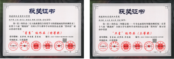 图3 获得第十八届挑战杯全国大学生课外学术科技作品竞赛黑科技专项赛星际级特等奖及卫星级三等奖