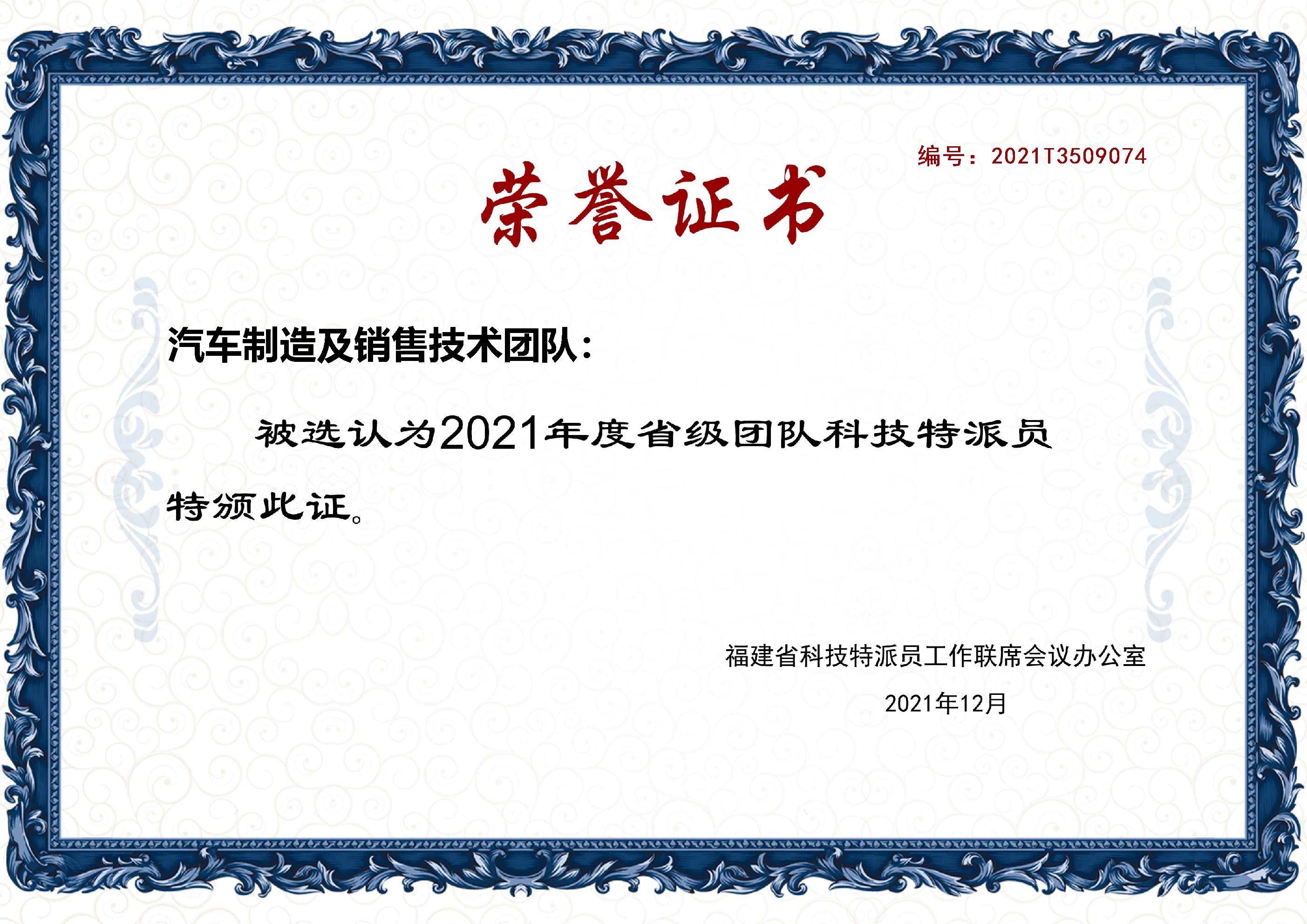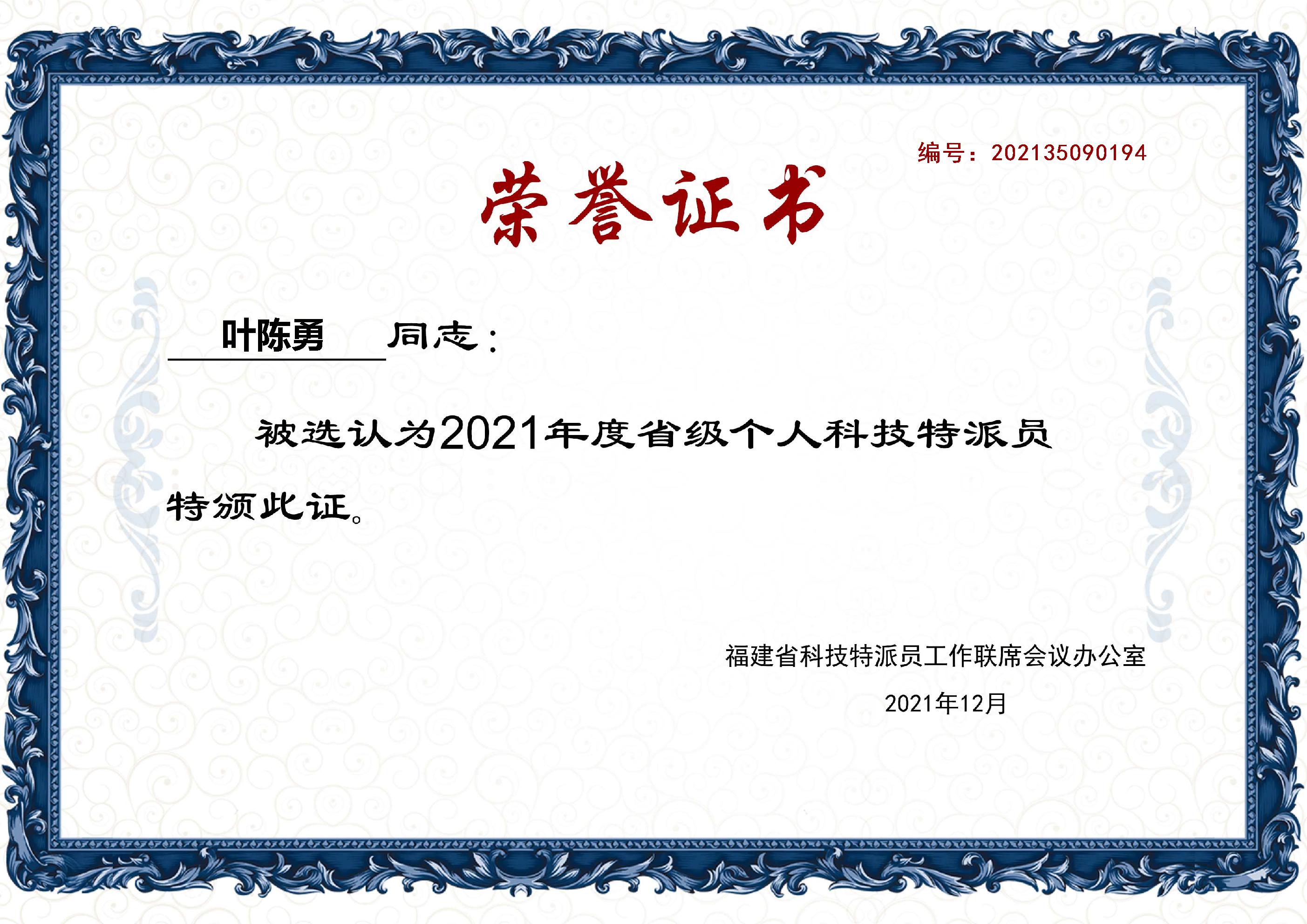 (五)2021年12月、2022年7月被福建省科技特派员工作联席会议办公室(福建省科学技术厅)选任为个人科技特派员、团队科技特派员